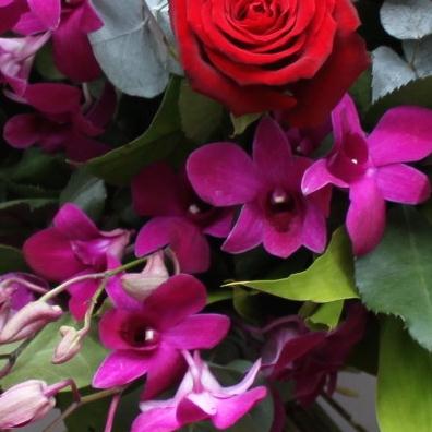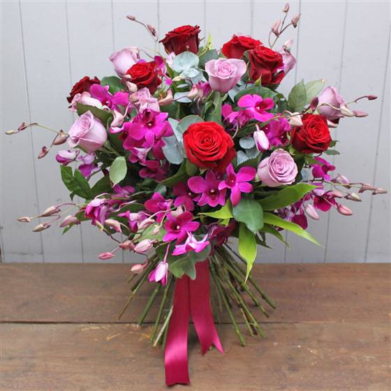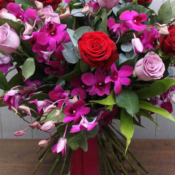 A sumptuous bouquet of deep velvety red and lilac roses mixed with dendrobium orchids. A real show stopper.