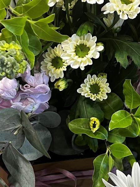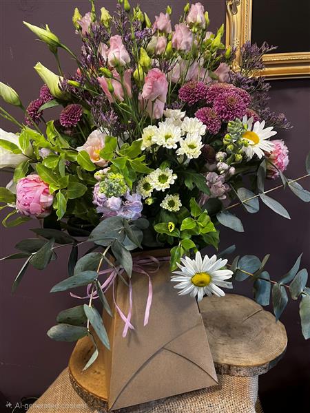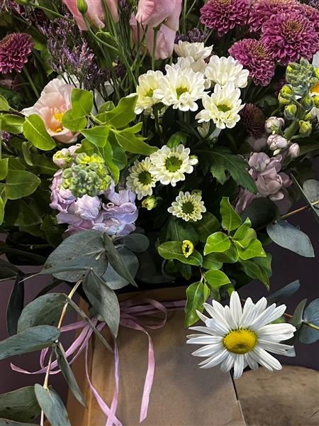 A relaxed, garden-style bouquet filled with soft pink lisianthus, lilac accents, white daisies and lush foliage. A naturally gathered design with gentle colour flow and timeless floral charm.