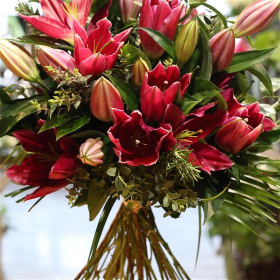 A large hand tied bouquet of highly scented pink lilies presented in water. Please note lilies will be delivered in bud to ensure maximum vase life. The tone of pink may vary.